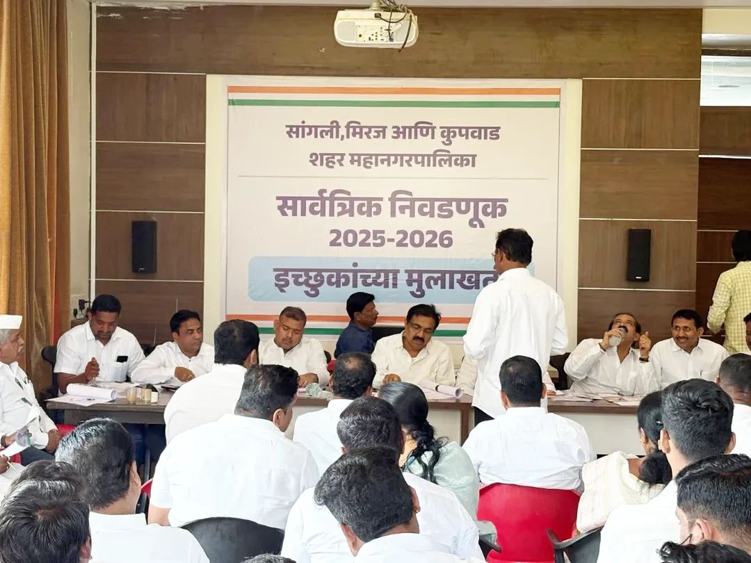 सांगली महानगरपालिकेच्या आगामी सार्वत्रिक निवडणुकीच्या पार्श्वभूमीवर महाविकास आघाडीतर्फे इच्छुक उमेदवारांच्या मुलाखती आज घेण्यात आल्या. या मुलाखतींमध्ये उमेदवारांची पक्षनिष्ठा, जनसंपर्क, सामाजिक कार्याचा अनुभव, स्थानिक प्रश्नांची जाण तसेच शहराच्या सर्वांगीण विकासाबाबतची दृष्टी यांचा सखोल आढावा घेतला गेला.