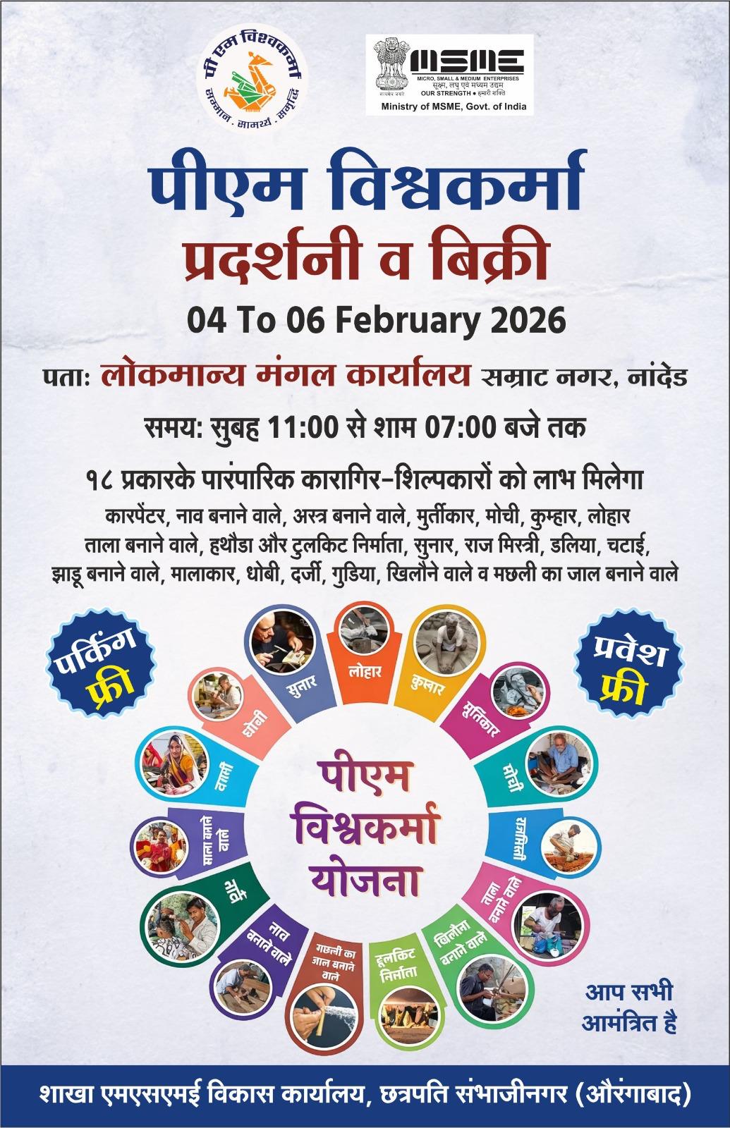 नांदेड :- सूक्ष्म, लघु आणि मध्यम उद्यम मंत्रालयाच्या एमएसएमई विकास कार्यालय, छत्रपती संभाजीनगर यांच्यावतीने पीएम विश्वकर्मा प्रदर्शन व विक्री कार्यक्रमाचे आयोजन नांदेड येथील लोकमान्य मंगल कार्यालय येथे दि. ४ ते ६ फेब्रुवारी २०२६ या कालावधीत करण्यात आले आहे.