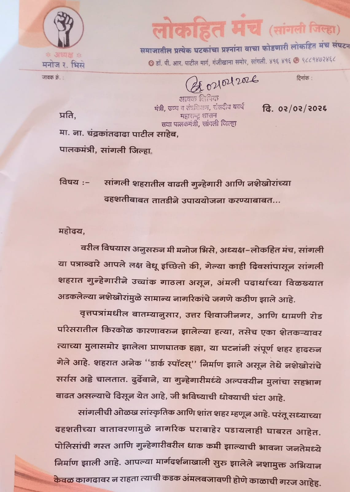 मी, मनोज भिसे, अध्यक्ष - लोकहित मंच, सांगली, या पत्राद्वारे आपले लक्ष सांगली शहरातील अत्यंत गंभीर आणि चिंताजनक परिस्थितीकडे वेधू इच्छितो. गेल्या काही दिवसांपासून सांगली शहरात गुन्हेगारीने उच्चांक गाठला असून, अमली पदार्थांच्या विळख्यात अडकलेल्या नशेखोरांमुळे सामान्य नागरिकांचे जगणे कठीण झाले आहे.
