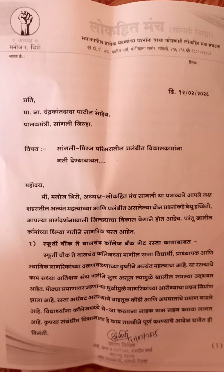 मी, मनोज भिसे, अध्यक्ष 'लोकहित मंच, सांगली', या पत्राद्वारे आपले लक्ष शहरातील अत्यंत महत्त्वाच्या आणि प्रलंबित असलेल्या दोन प्रश्नांकडे वेधू इच्छितो. आपल्या मार्गदर्शनाखाली जिल्ह्याचा विकास वेगाने होत आहेच, परंतु खालील कामांच्या धिम्या गतीने नागरिक त्रस्त आहेत:
