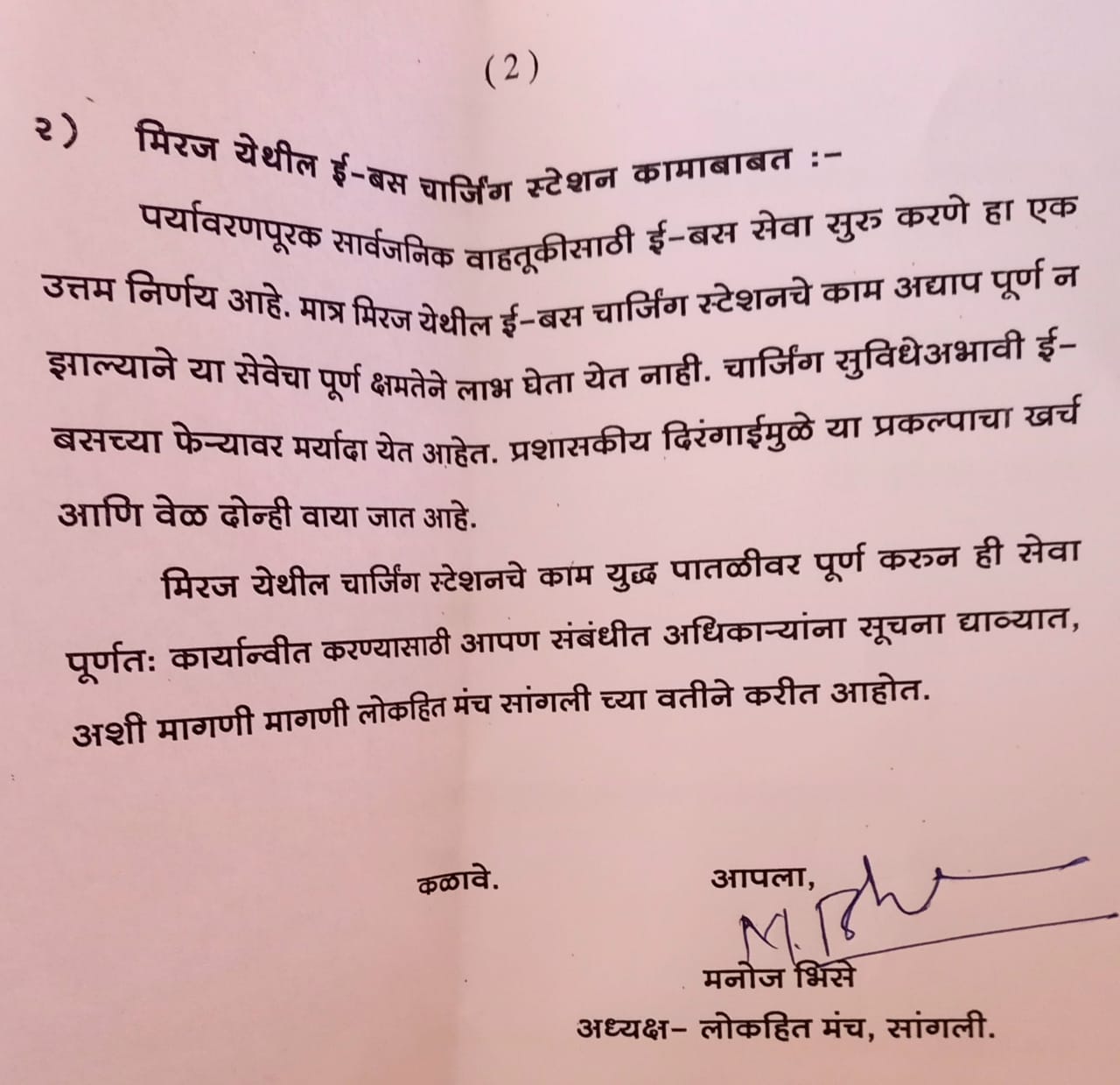 पर्यावरणपूरक सार्वजनिक वाहतुकीसाठी ई-बस सेवा सुरू करणे हा एक उत्तम निर्णय आहे. मात्र, मिरज येथील ई-बस चार्जिंग स्टेशनचे काम अद्याप पूर्ण न झाल्याने या सेवेचा पूर्ण क्षमतेने लाभ घेता येत नाही.