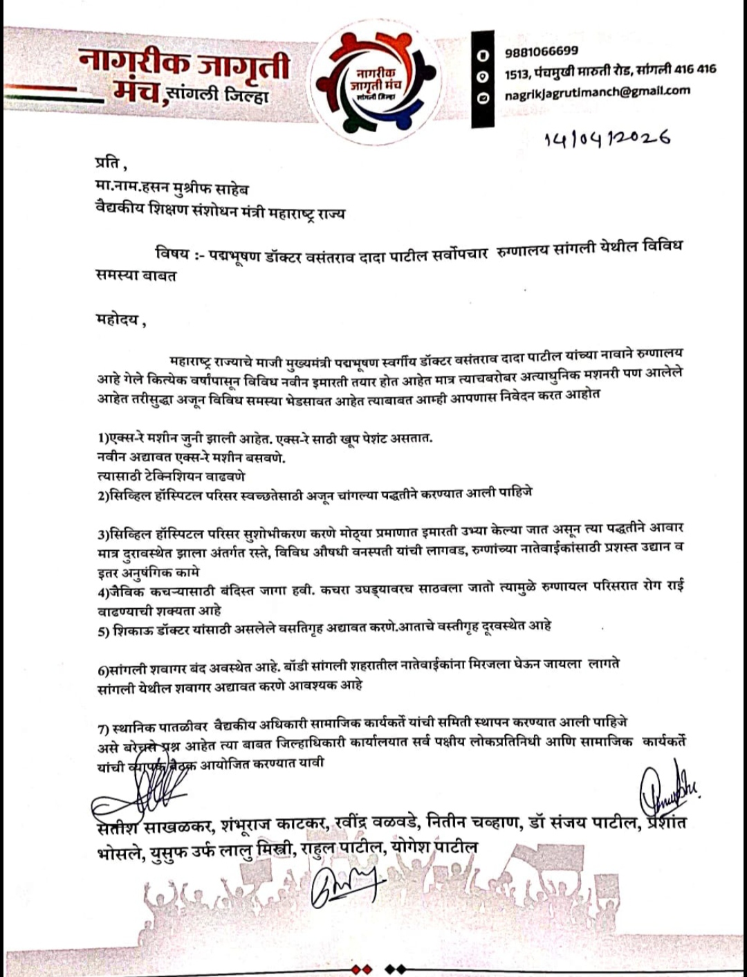 विषय :- पद्मभूषण डॉक्टर वसंतराव दादा पाटील सर्वोपचार रुग्णालय सांगली येथील विविध समस्या बाबत