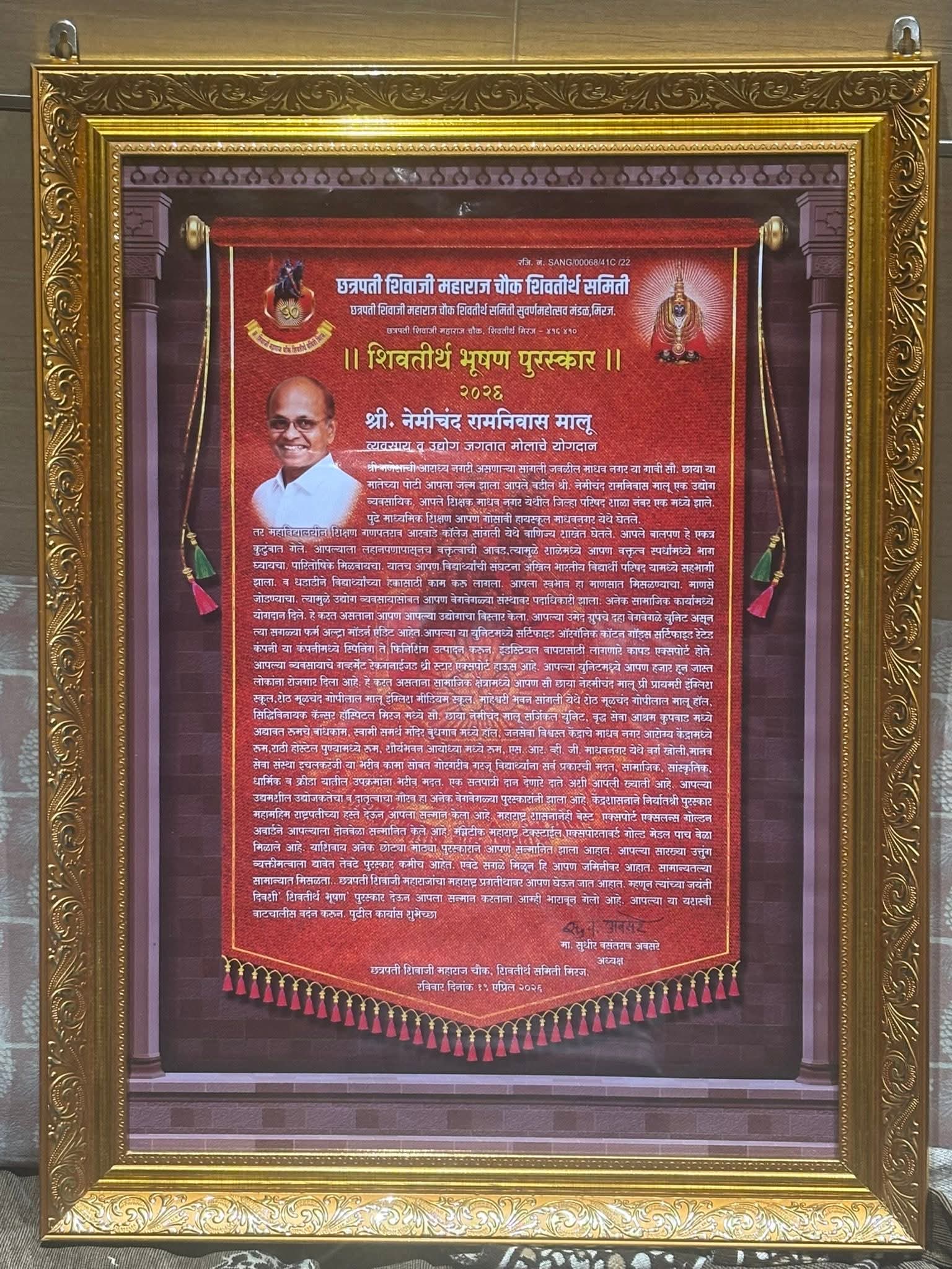 शिवतीर्थ भूषण पुरस्कार मिरज मध्ये श्रीमंत गंगाधरपंथ उर्फ बाळासाहेब पटवर्धन सरकार यांचे शुभहस्ते मा सतिश मालू यांना प्रदान करण्यात आला.