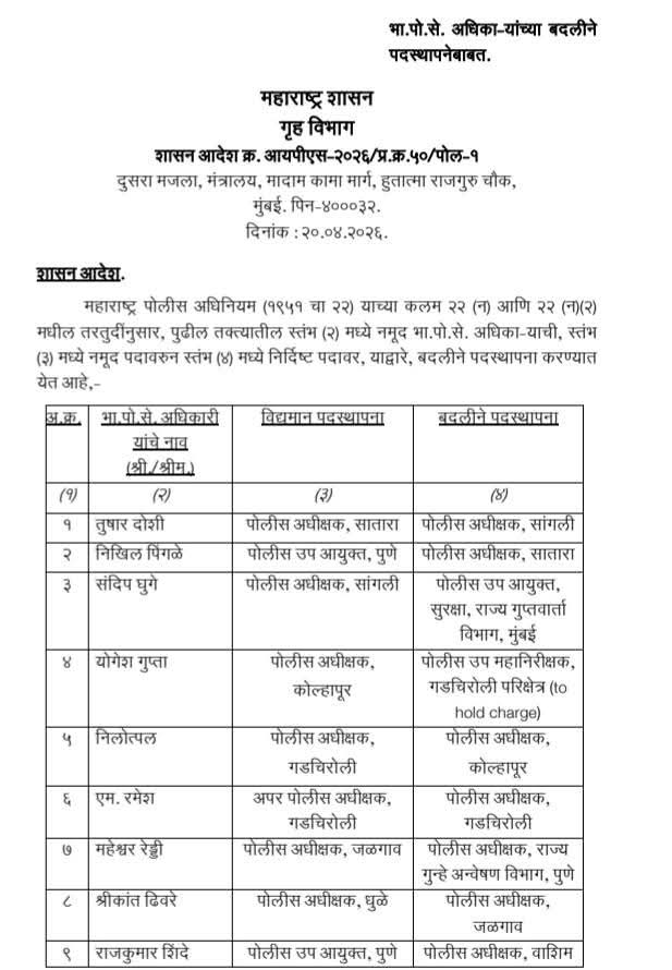 साताऱ्याचे पोलीस अधीक्षक म्हणून कार्यरत असलेले तुषार दोषी यांची आता सांगलीचे नवे पोलीस अधीक्षक म्हणून नियुक्ती करण्यात आली आहे. सांगलीचे पोलीस अधीक्षक म्हणून कार्यभार सांभाळणारे संदीप घुगे यांची बदली पोलीस उपआयुक्त, सुरक्षा (राज्य गुप्तवार्ता विभाग), मुंबई या पदावर करण्यात आली आहे.