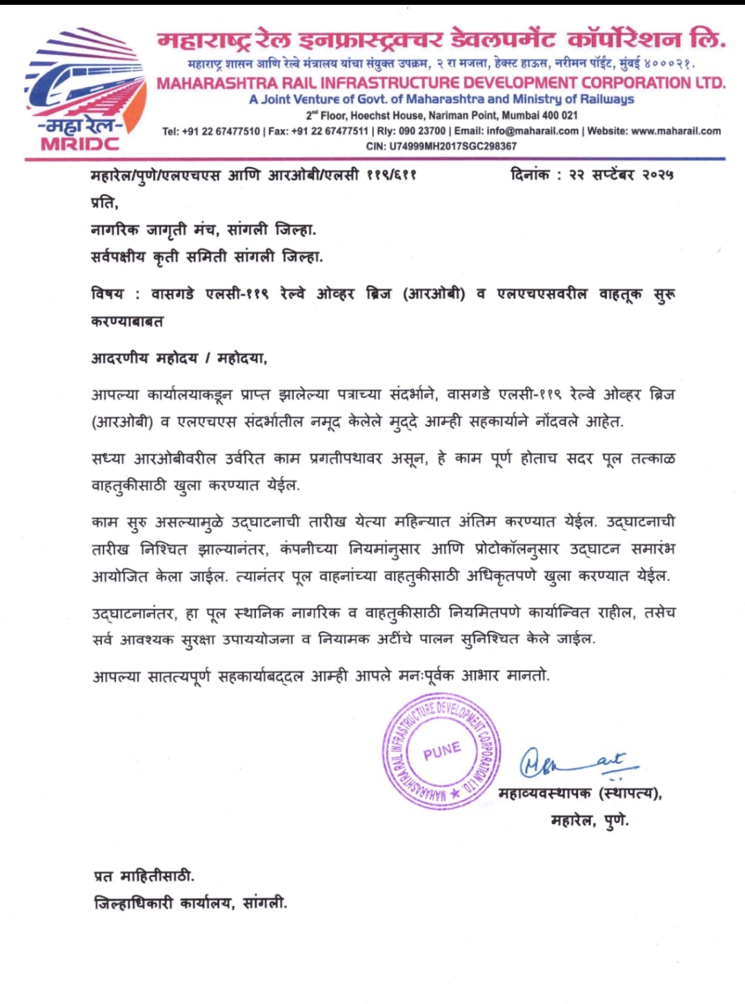 वसगडे रेल्वे उड्डाणपुलाचे लोकार्पण करण्यासाठी केंद्रीय मंत्री नितीनजी गडकरी व उपमुख्यमंत्री एकनाथजी शिंदे यांच्या हस्ते करण्यासाठी रेल्वे बोर्डाने जिल्हाधिकारी यांच्याशी पत्र व्यवहार केला होता आम्ही आंदोलनाची इशारा दिल्यानंतर आम्हाला सुद्धा पत्र दिले होते मात्र ह्या सगळ्या तारखा ओलांडून गेले आहेत तरीसुद्धा रेल्वेचा कारभार हा भंपकपणाचा वाटत आहे.