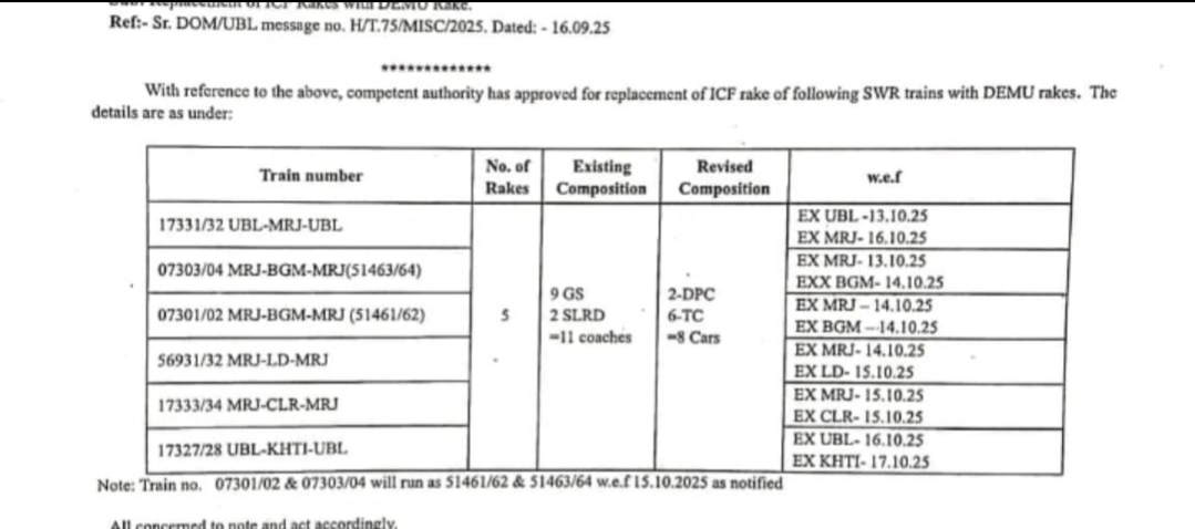 दक्षिण पश्चिम रेल्वेच्या हुबळी विभागाकडून काही एक्सप्रेस व पॅसेंजर गाड्या आयसीएफ डब्यांच्या ऐवजी डेमु चालवणार आहे.