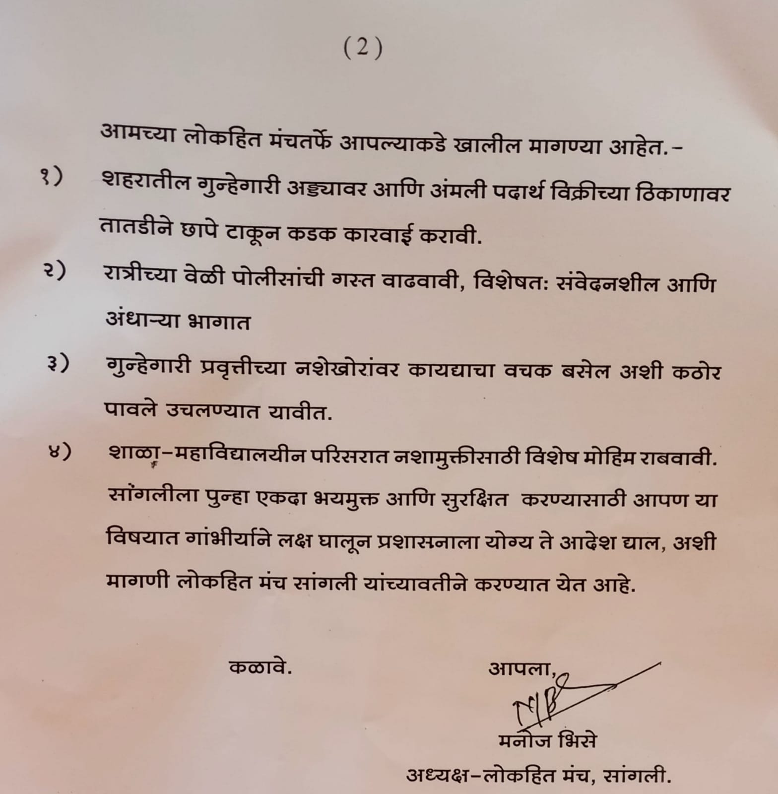 मी, मनोज भिसे, अध्यक्ष - लोकहित मंच, सांगली, या पत्राद्वारे आपले लक्ष सांगली शहरातील अत्यंत गंभीर आणि चिंताजनक परिस्थितीकडे वेधू इच्छितो. गेल्या काही दिवसांपासून सांगली शहरात गुन्हेगारीने उच्चांक गाठला असून, अमली पदार्थांच्या विळख्यात अडकलेल्या नशेखोरांमुळे सामान्य नागरिकांचे जगणे कठीण झाले आहे.