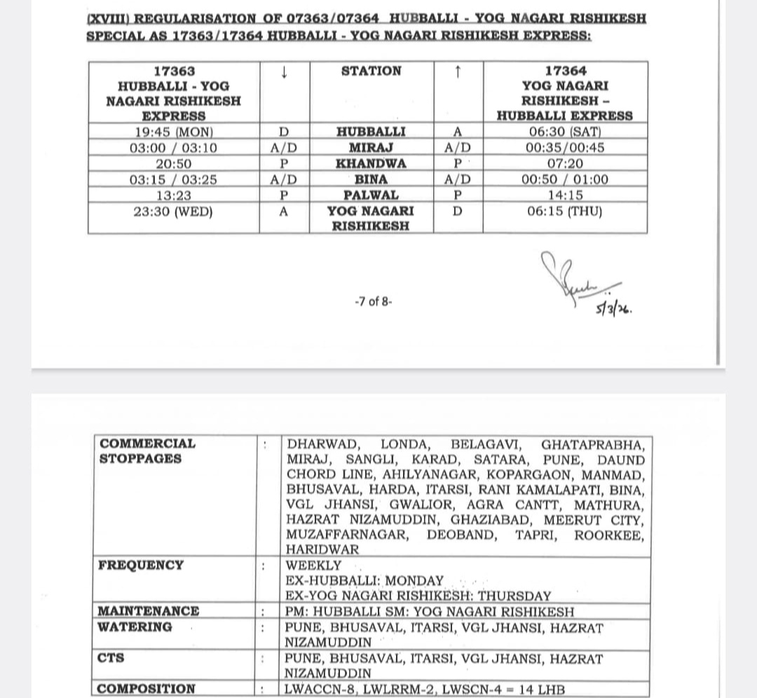 गाडी क्रमांक 07363/64 हुबळी ते योगनगरी ऋषिकेश साप्ताहिक स्पेशल आता कायमस्वरूपी गाडी क्रमांक 17363/64 हुबळी योगनगरी ऋषिकेश (हरिद्वार) साप्ताहिक एक्सप्रेस म्हणून धावेल.